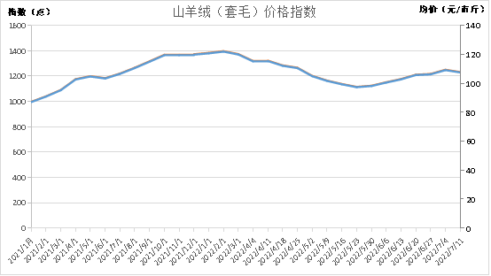 截至2022年7月11日,山羊绒(套毛)价格指数报1235.36点,周环比(2022年7月4日,下同)下跌1.47%,山羊绒(套毛)价格报107.6元/市斤,较上周同期下跌1.6元/市斤。