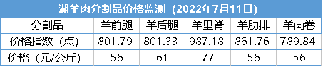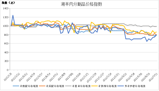 截至2022年7月11日,羊前腿价格指数报801.79点,周环比上涨3.70%,价格报56元/公斤;羊后腿价格指数报801.33点,周环比下跌3.17%,价格报61元/公斤;羊里脊价格指数报987.18点,周环比持平,价格报77元/公斤;羊肋排价格指数报861.76点,周环比上涨1.82%,价格报56元/公斤;羊肉卷价格指数报789.84点,周环比上涨5.66%,价格报56元/公斤。