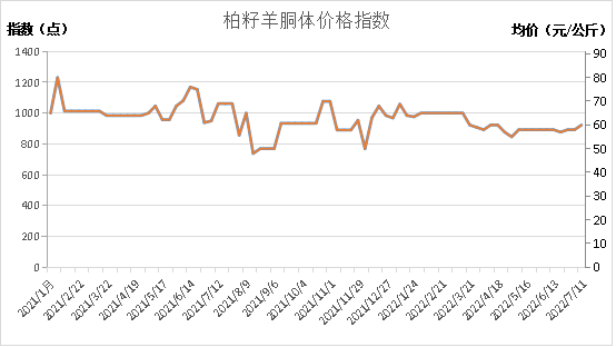 截至2022年7月11日,柏籽羊胴体价格指数报923.17点,周环比上涨3.45%,柏籽羊胴体价格报60元/公斤。