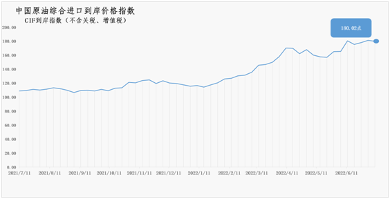 海关总署全球贸易监测分析中心和上海石油天然气交易中心联合发布的中国原油综合进口到岸价格指数显示,2022年7月4日-7月10日,中国原油综合进口到岸价格指数为180.02,环比下降0.70%,同比上涨65.02%。