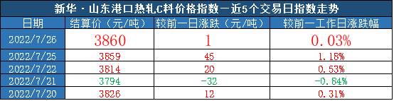 截至2022年7月26日,新华·山东港口热轧C料价格指数报3860元/吨,较前一交易日上涨1元/吨,涨幅0.03%。