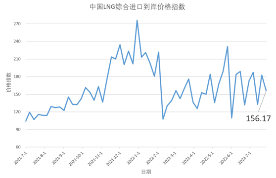 海关总署全球贸易监测分析中心和上海石油天然气交易中心联合发布的中国LNG综合进口到岸价格指数显示,7月18日-24日中国LNG综合进口到岸价格指数为156.17,环比下跌14.48%,同比上涨27.67%。
