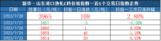 新华财经·指数|山东港口大商中心钢坯、热轧C料价格指数日报(7月28日)