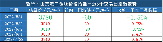 新华财经·指数|山东港口大商中心钢坯、热轧C料价格指数日报(8月4日)