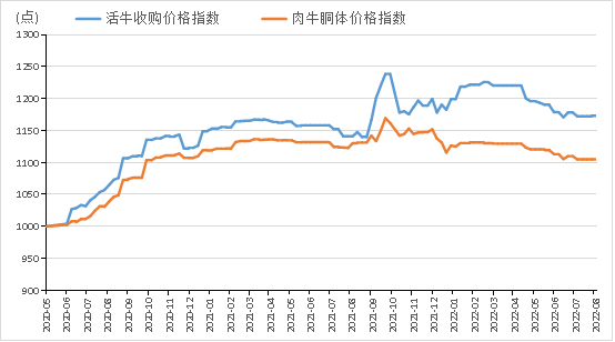 截至2022年8月1日,阳信活牛收购价格指数报1173.28点,环比(2022年7月4日,下同)上涨0.10%;阳信肉牛胴体价格指数报1104.82点,环比持平。