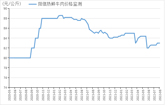 阳信热鲜牛肉价格监测数据显示,截至2022年8月1日,阳信热鲜牛肉价格报83元/公斤,环比上涨0.40元/公斤,涨幅0.48%。