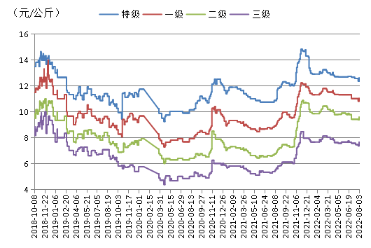新疆产区方面,截至8月4日,与上周同期相比,一级至三级骏枣每公斤出货均价分别上涨0.12元至0.19元不等,特级灰枣每公斤出货均价下跌0.01元,一级灰枣每公斤出货均价上涨0.02元。调研显示,下游枣制品企业逐步开始生产加工中秋消费品,带动了红枣需求,但还尚未大规模生产,目前个别产区枣企率先上调售价,走货量增长不明显。未来短期,新疆产区红枣价格或将微幅上行。