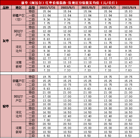 数据显示,截至8月4日,新华(阿拉尔)红枣价格指数报847.64点,周环比上涨0.48%,分地区看,新疆产区红枣价格指数周环比上涨0.59%,批发市场红枣价格指数周环比上涨0.42%。