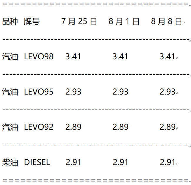 与2022年8月1日相比,8月8日新加坡汽、柴油零售价格不变。最近一次价格调整日期为2022年7月22日。