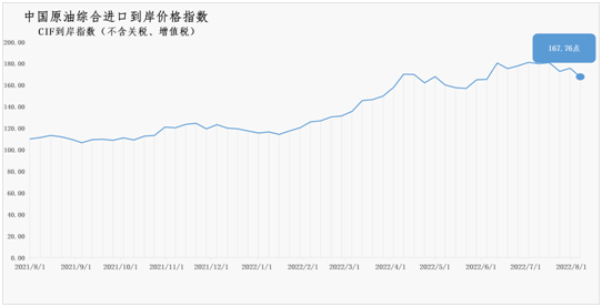 8月1日-7日中国原油综合进口到岸价格指数为167.76 环比下降4.52%