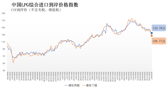中国液化石油气(LPG)综合进口到岸价格指数显示,2022年8月1日-7日,中国液化丙烷综合进口到岸价格指数为135.78;中国液化丁烷综合进口到岸价格指数为128.77。
