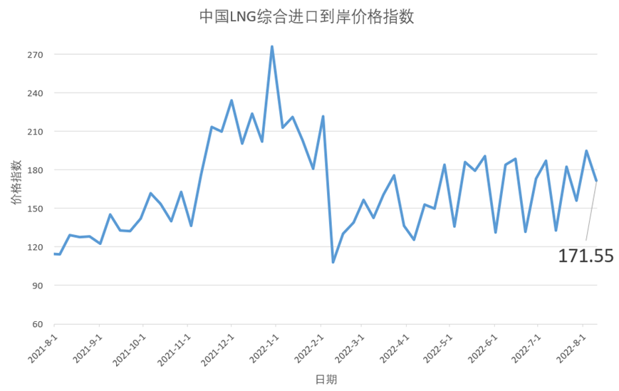 海关总署全球贸易监测分析中心和上海石油天然气交易中心联合发布的中国LNG综合进口到岸价格指数显示,2022年8月1日-7日,中国LNG综合进口到岸价格指数为171.55,环比下跌12.07%,同比上涨31.00%。