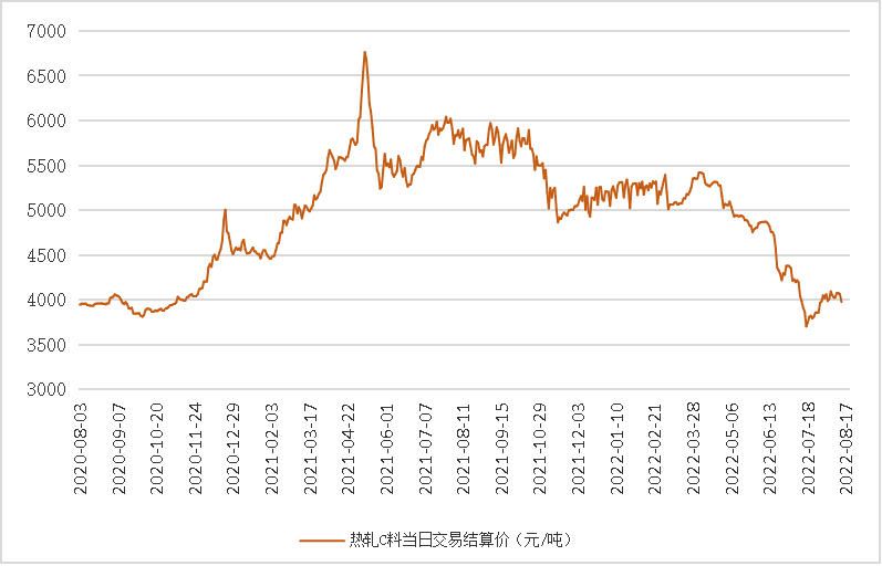 截至2022年8月17日,新华·山东港口热轧C料价格指数报3977元/吨,较前一交易日下跌79元/吨,跌幅1.95%。