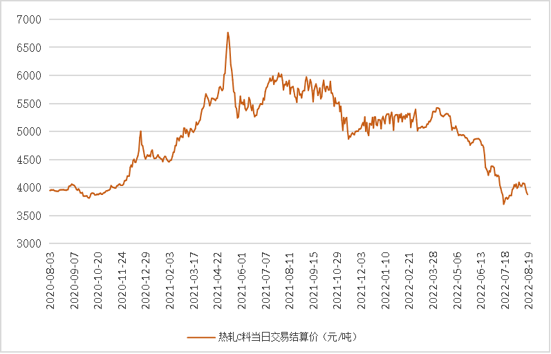截至2022年8月19日,新华·山东港口热轧C料价格指数报3876元/吨,较前一交易日下跌35元/吨,跌幅0.89%。