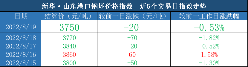 新华财经北京8月19日电(吕世阔) 截至2022年8月19日,新华·山东港口钢坯价格指数报3750元/吨,较前一交易日下跌20元/吨,跌幅0.53%。