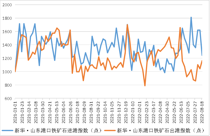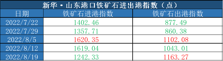 截至2022年8月19日,新华·山东港口铁矿石进港指数报1242.33点,较8月12日下跌376.71点,跌幅23.27%;新华·山东港口铁矿石出港指数报1163.27点,较8月12日上涨120.26点,涨幅11.53%。
