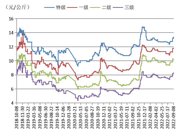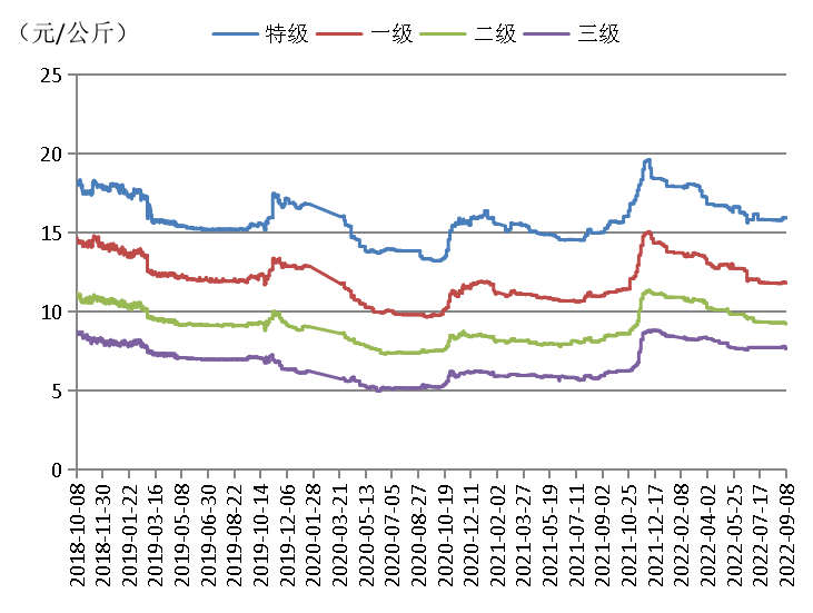 新疆产区方面,截至9月8日,与上周同期相比,各等级骏枣价格持平,一级、二级、三级灰枣每公斤出货均价分别下跌0.04元至0.14元不等。调研显示,新疆产区部分地区因流通受阻,中秋节红枣出货不畅,本年度中秋节并未对新疆红枣市场带来较大幅度的提振效果,红枣交易整体持稳。未来短期,新疆产区红枣价格或将保持稳定。