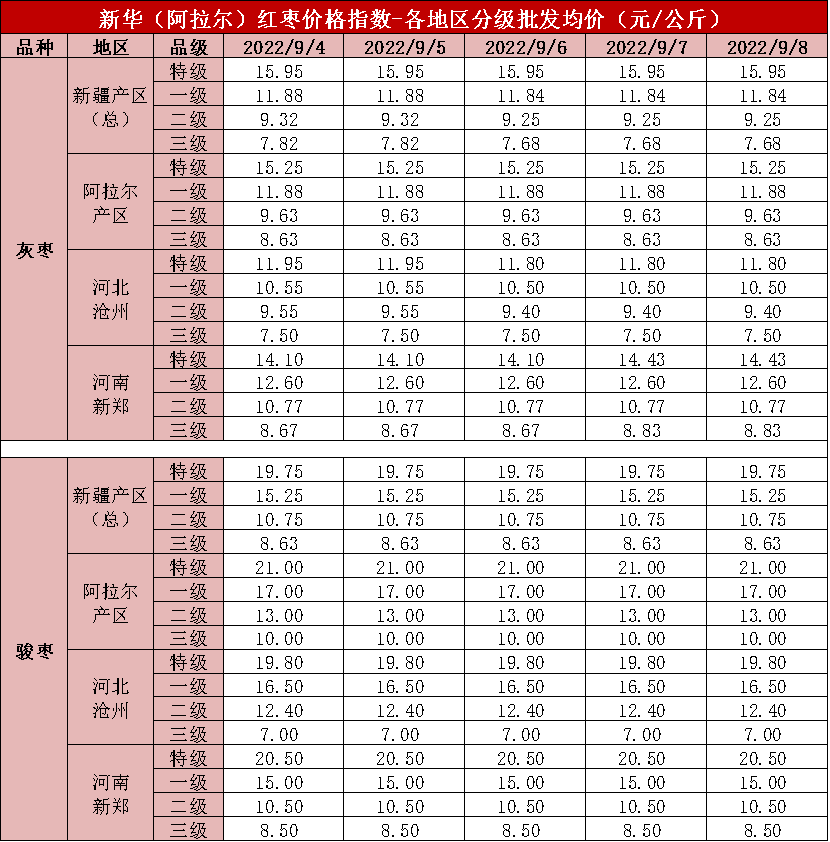 9月8日发布的新一期新华(阿拉尔)红枣价格指数显示,9月2日至9月8日当周,新疆产区红枣价格周环比微幅下跌,批发市场红枣价格周环比微幅上涨。