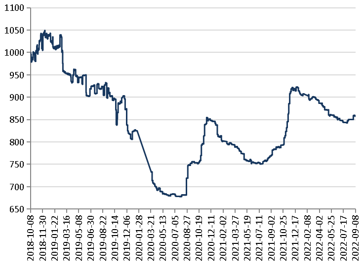 数据显示,截至9月8日,新华(阿拉尔)红枣价格指数报858.77点,周环比下跌0.08%,分地区看,新疆产区红枣价格指数周环比下跌0.45%,批发市场红枣价格指数周环比上涨0.12%。