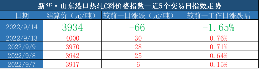 新华财经·指数|山东港口大商中心钢坯、热轧C料价格指数日报(9月14日)