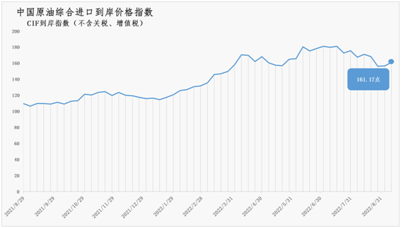 9月5日-11日中国原油综合进口到岸价格指数为161.17 环比上涨2.82%