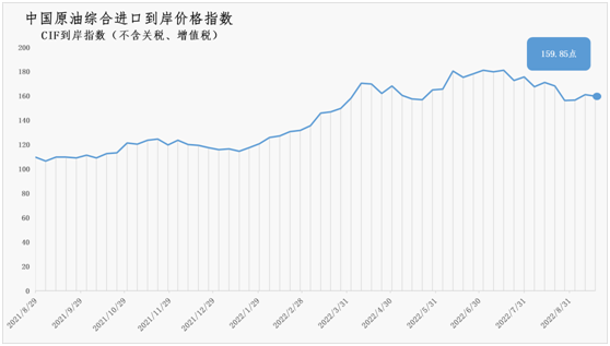 9月12日-18日中国原油综合进口到岸价格指数为159.85 环比下降0.82%
