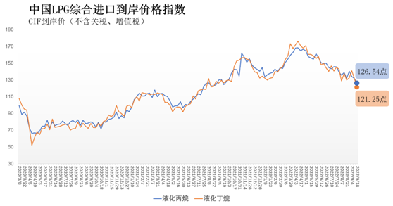 9月12日-18日中国液化丙烷、丁烷综合进口到岸价格指数为126.54、121.25