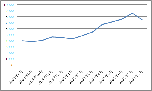 图:2021年8月-2022年8月中国进口保税航空煤油到岸价格走势