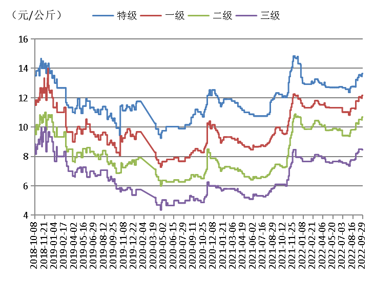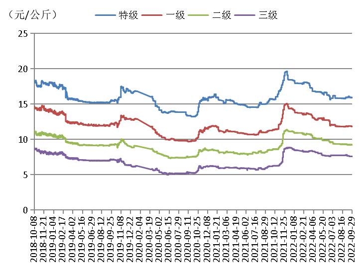 新疆产区方面,截至9月29日,与上周同期相比,各等级骏枣价格持平,一级灰枣每公斤出货均价下跌0.04元。调研显示,目前新疆产区部分地区开展防疫管控,相关地区红枣暂无出货,在新产季红枣上市前,产区整体出货保持弱稳状态,价格随行就市,调整空间有限。未来短期,新疆产区红枣价格或将基本稳定。