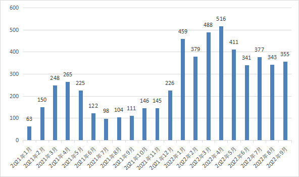 图表1: 2021年以来欧盟分月天然气消费量(单位:百万立方米)