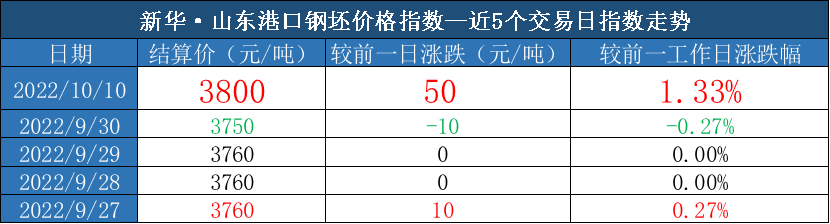 新华财经·指数|山东港口大商中心钢坯、热轧C料价格指数日报(10月10日)