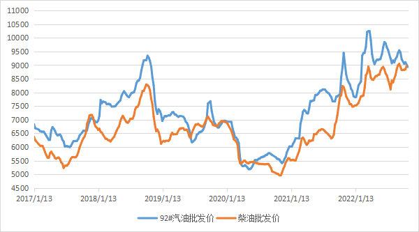 图表:中国汽柴油批发价格指数周度均价走势图(单位:元/吨)