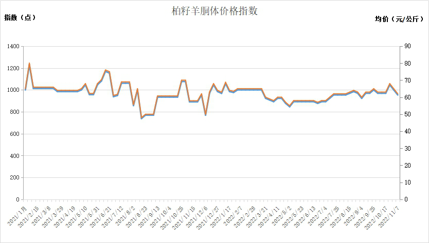 截至2022年11月8日,柏籽羊胴体价格指数报953.94点,较上期下跌4.61%,价格报62元/公斤,较上期下跌3元/公斤。