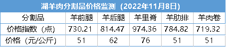 截至2022年11月8日,与上期相比,各湖羊肉分割品两种产品价格出现小幅上涨。
