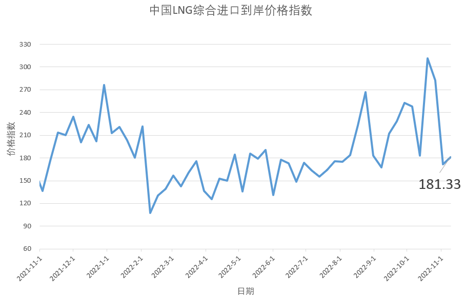海关总署全球贸易监测分析中心和上海石油天然气交易中心联合发布的中国LNG综合进口到岸价格指数显示,2022年10月31日-11月6日,中国LNG综合进口到岸价格指数为181.33,环比上涨5.52%,同比上涨2.86%。