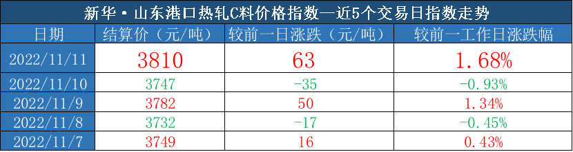 新华财经·指数|山东港口大商中心钢坯、热轧C料价格指数日报(11月11日)