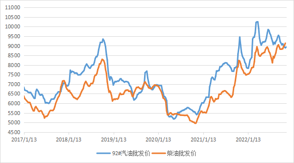 图表:中国汽柴油批发价格指数周度均价走势图(单位:元/吨)