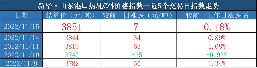 新华财经·指数|山东港口大商中心钢坯、热轧C料价格指数日报(11月15日)