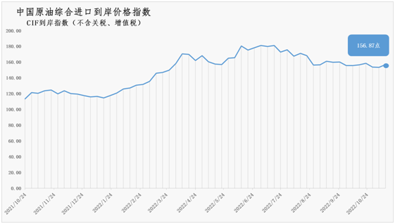 11月7日-13日中国原油综合进口到岸价格指数为156.87 环比上涨2.16%