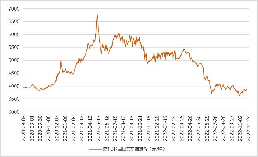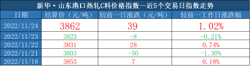 截至2022年11月24日,新华·山东港口热轧C料价格指数报3862元/吨,较前一交易日上涨39元/吨,涨幅1.02%。