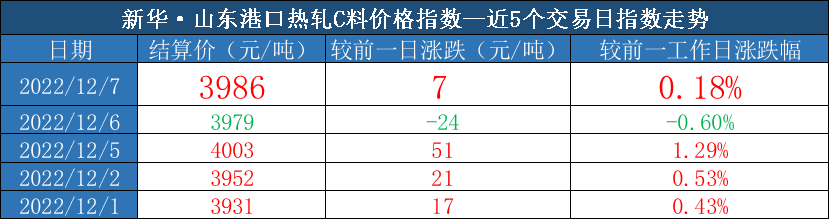 截至2022年12月7日,新华·山东港口热轧C料价格指数报3986元/吨,较前一交易日上涨7元/吨,涨幅0.18%。