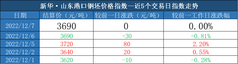 新华财经北京12月7日电(吕世阔)截至2022年12月7日,新华·山东港口钢坯价格指数报3690元/吨,较前一交易日持平。