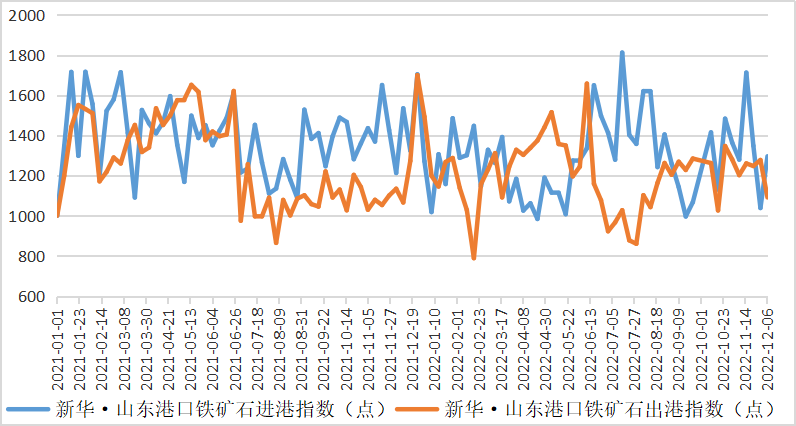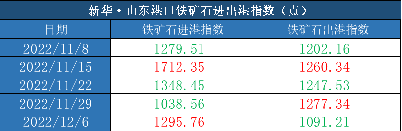 截至2022年12月6日,新华·山东港口铁矿石进港指数报1295.76点,较11月29日上涨257.20点,涨幅24.76%;新华·山东港口铁矿石出港指数报1091.21点,较11月29日下跌186.12点,跌幅14.57%。