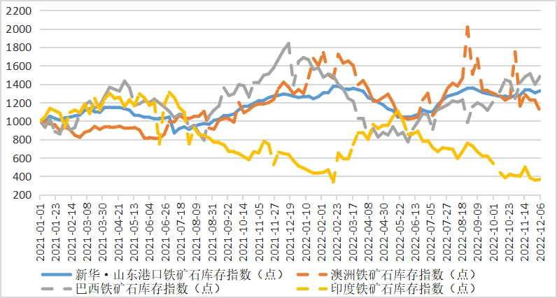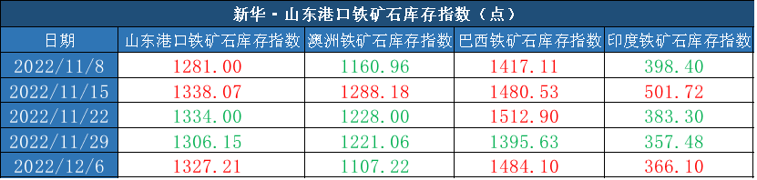 截至2022年12月6日,新华·山东港口铁矿石库存指数报1327.21点,较11月29日上涨21.06点,涨幅1.61%。