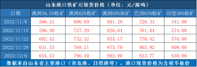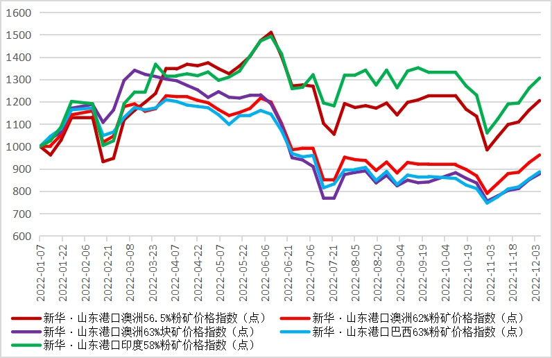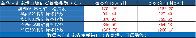 截至2022年12月6日,新华·山东港口铁矿石价格指数小幅上行,指数已连续四周出现上涨。
