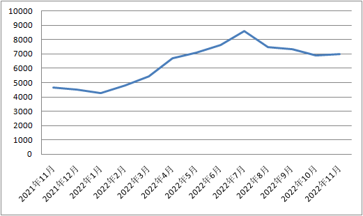 图:2021年11月-2022年11月中国进口保税航空煤油到岸价格走势
