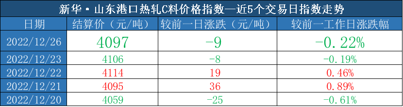 截至2022年12月26日,新华·山东港口热轧C料价格指数报4097元/吨,较前一交易日下跌9元/吨,跌幅0.22%。