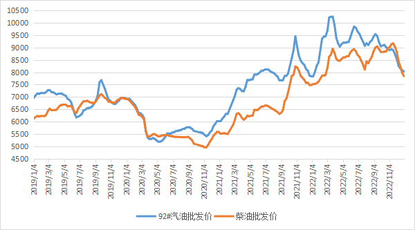 图表:中国汽柴油批发价格指数周度均价走势图(单位:元/吨)