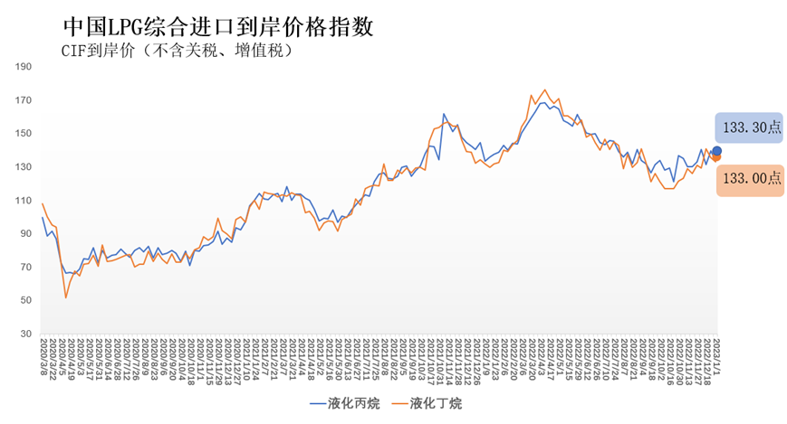 2022年12月26日-2023年1月1日中国液化丙烷、丁烷综合进口到岸价格指数为133.30、133.00