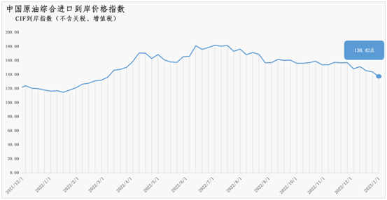 2022年12月26日-2023年1月1日中国原油综合进口到岸价格指数为136.42 环比下降4.98%